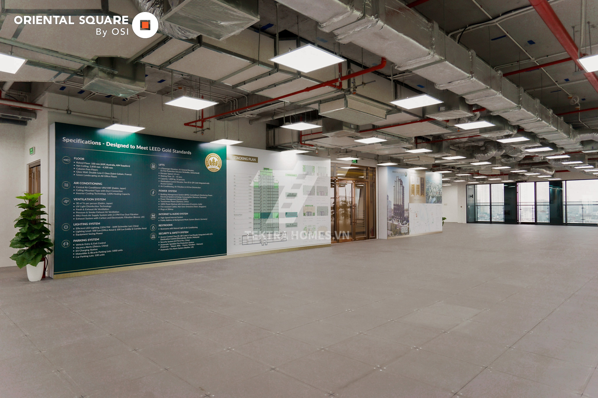 Điểm nổi bật của Oriental Square là chứng chỉ LEED Gold (Hoa Kỳ) – tiêu chuẩn công trình xanh quốc tế, mang đến môi trường làm việc tiết kiệm năng lượng, thân thiện với sức khỏe người sử dụng, đặc biệt phù hợp với các doanh nghiệp nước ngoài, tập đoàn đa quốc gia.